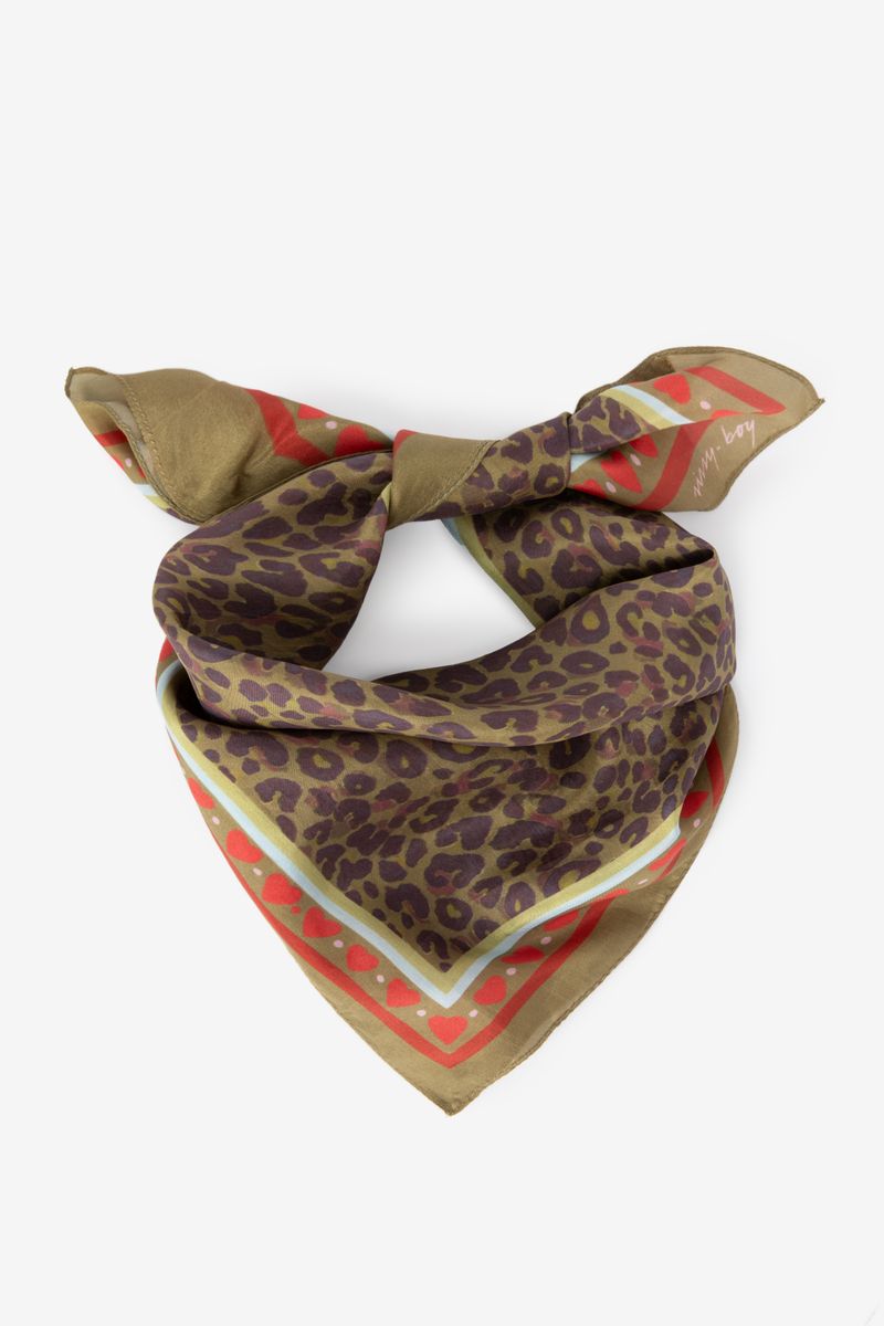 Afmeting: 50 x 50 cm. Donkergroene sjaal met leopard print van Sissy-Boy Deze sjaal heeft een glanzende look en is bedrukt met een all-over leopard print.