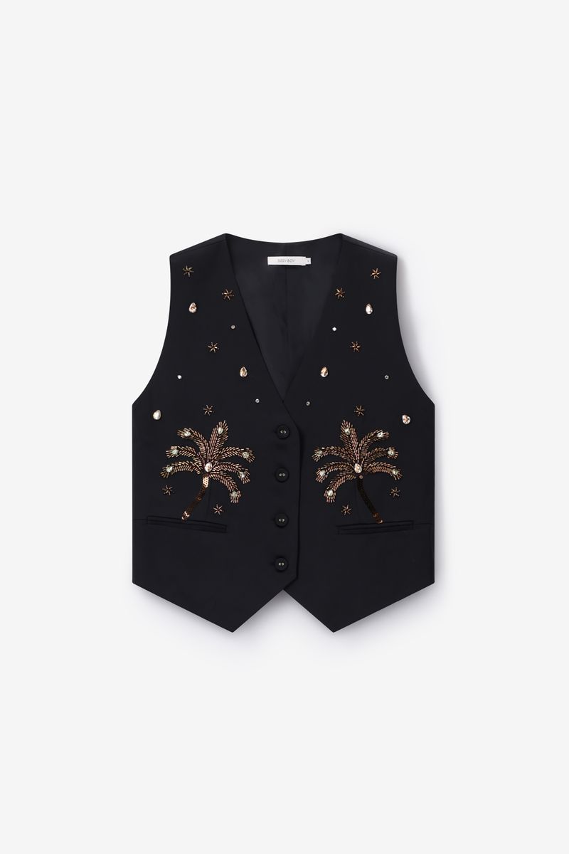 Verder heeft het gilet aan de voorzijde twee palmbomen met pailletten en kralen details. Het gilet heeft een aangesloten pasvorm, een V-halslijn, een knoopsluiting en een strikdetail op de achterzijde.