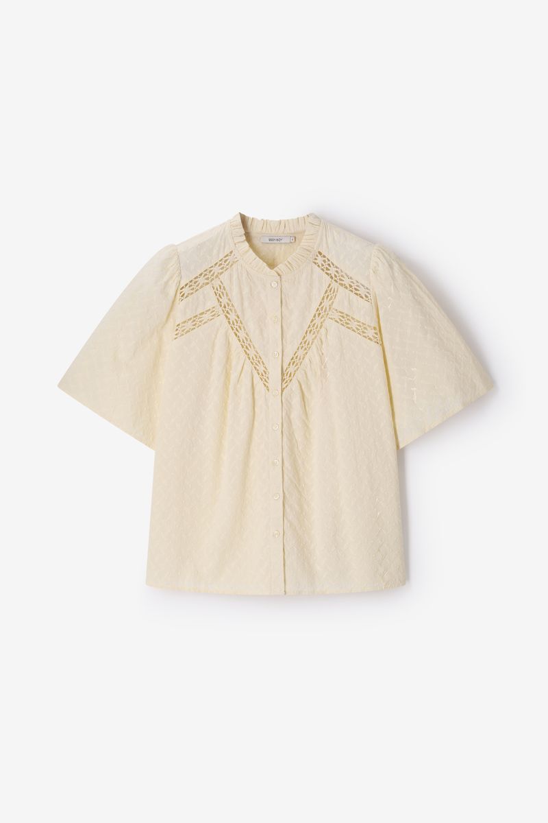 Verder heeft de blouse een lichtgele kleur met een broderie anglaise design aan de voorzijde. De blouse heeft korte mouwen, een ronde halslijn, geplooide details en een regular fit.