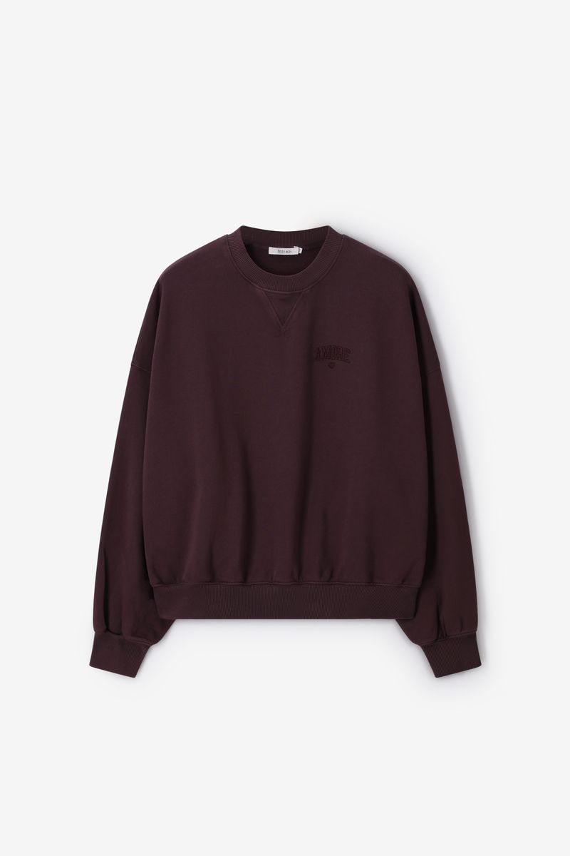 Verder heeft de sweater een donkerbruine kleur met een subtiele borduursel op de voorzijde. De sweater heeft lange mouwen, een ronde halslijn, ribboorden en een oversized fit.