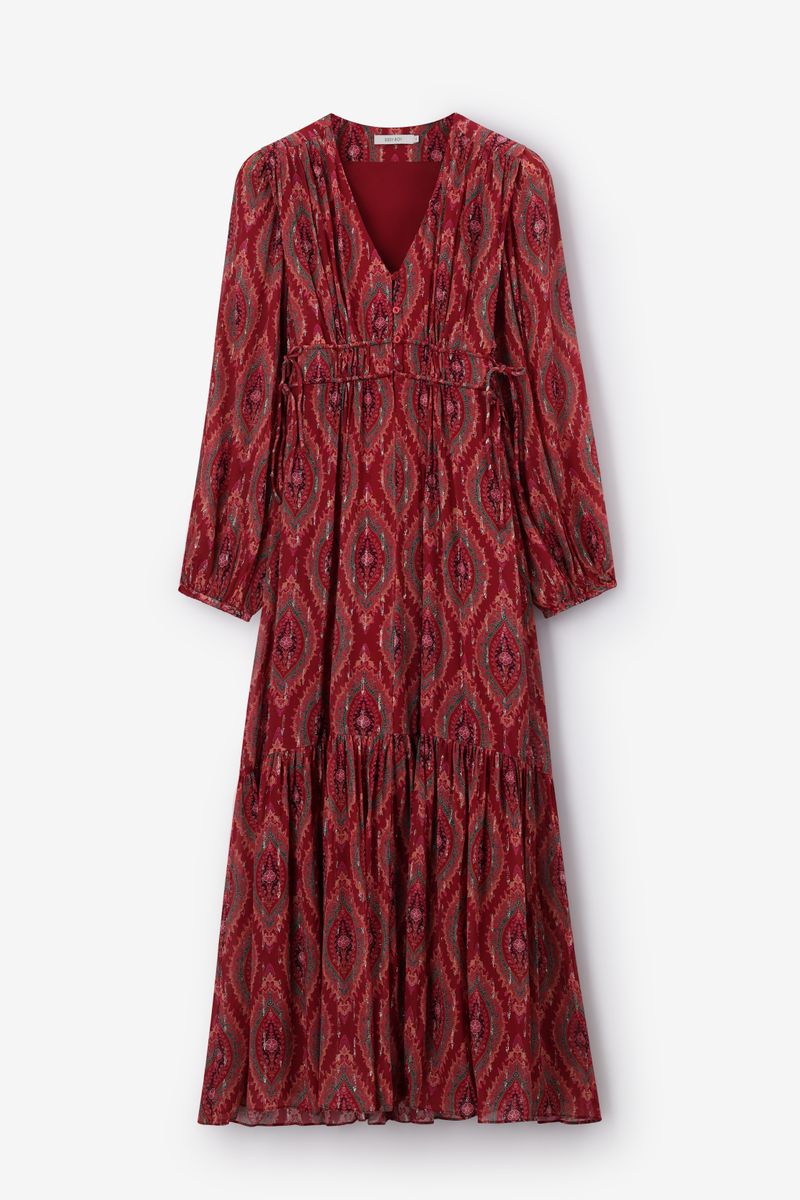 Het model heeft een lengte van 1.77 meter en draagt maat S. Verder heeft de jurk een rode kleur met een all-over print met groene en donkerrode details.