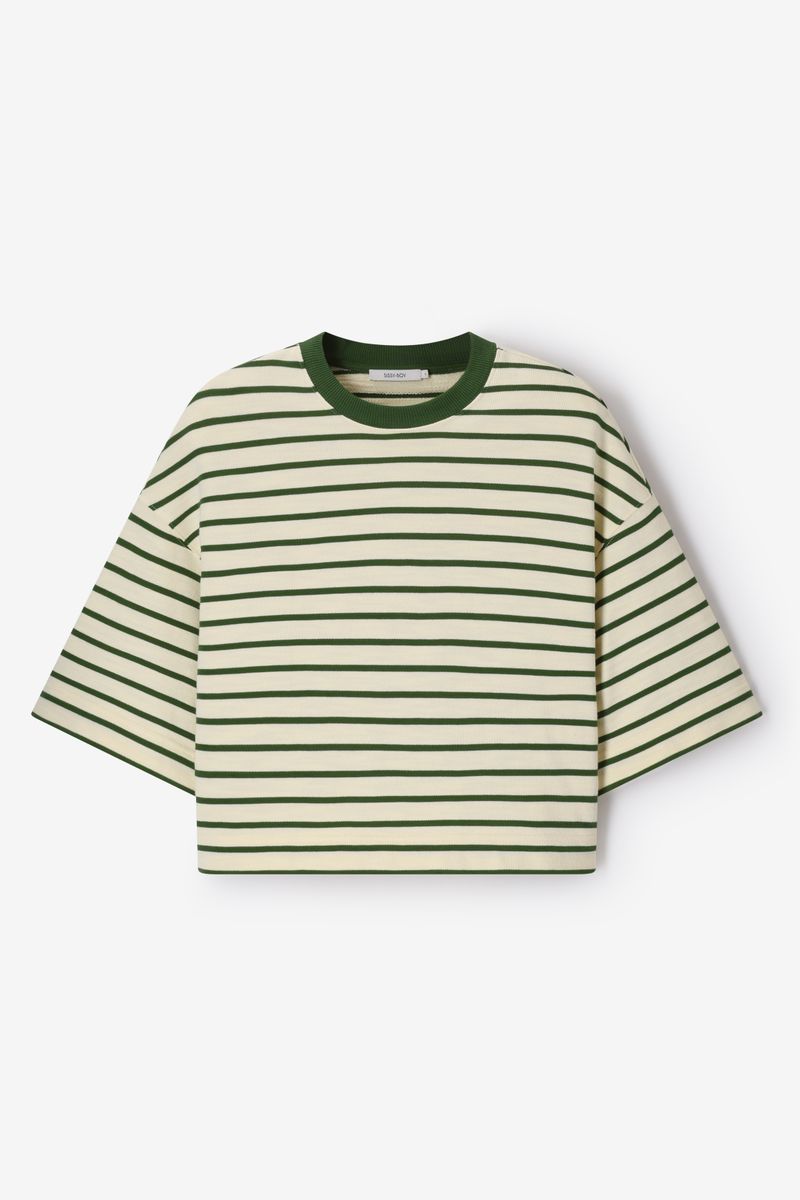 Verder heeft de sweater een lichtgele kleur met all-over groene strepen. De sweater heeft korte wijde mouwen, een ronde halslijn, verlaagde schouders en een boxy fit.