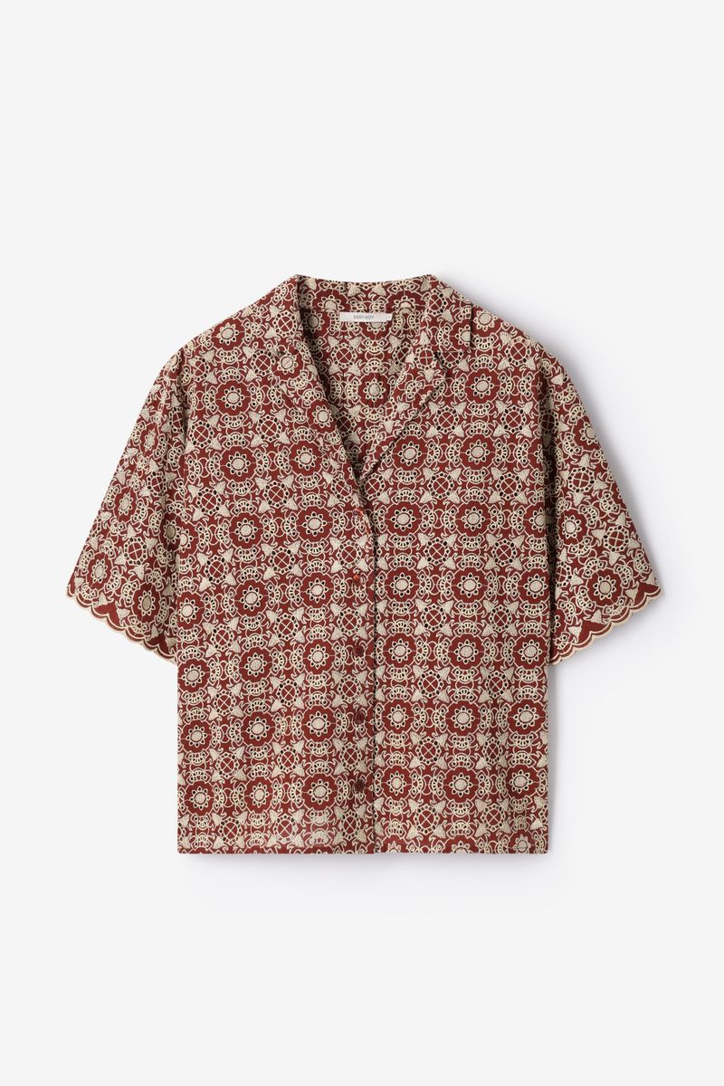 Verder heeft de blouse een donkerrode kleur met all-over broderie details. De blouse heeft korte mouwen, een knoopsluiting, een kraag en een v-halslijn.