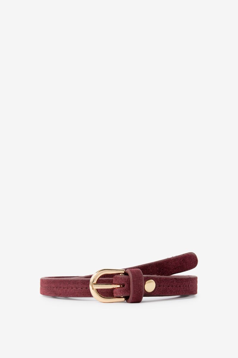 De riem heeft een donkerrode kleur en een goudkleurige gesp. Donkerrode suède riem van Sissy-Boy.