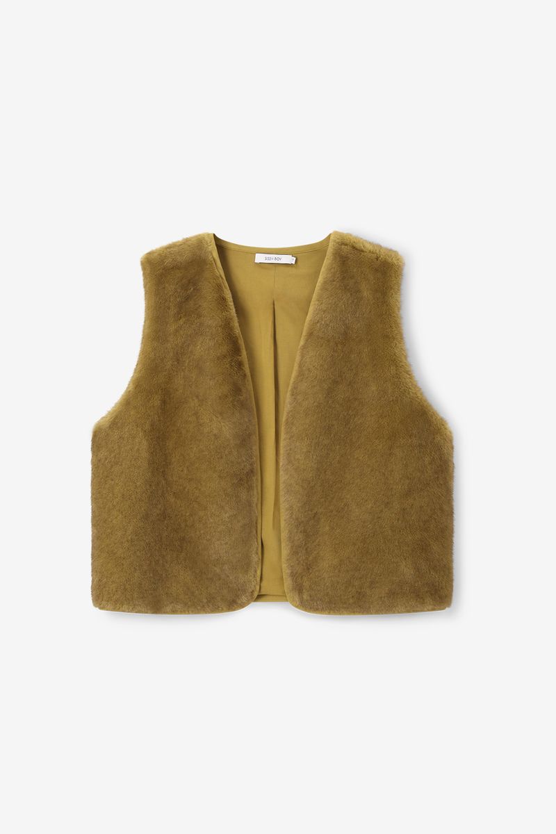 Het gilet is gevoerd, mouwloos en heeft geen sluiting. Donkergroen faux fur gilet van Sissy-Boy.