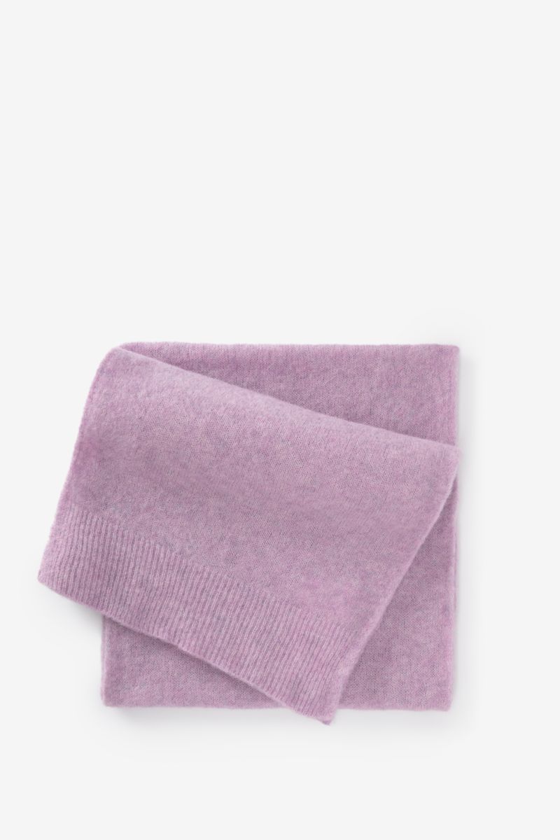 De sjaal heeft een lichtpaarse kleur en een ribboord. Lichtpaarse wollen sjaal van Sissy-Boy.
