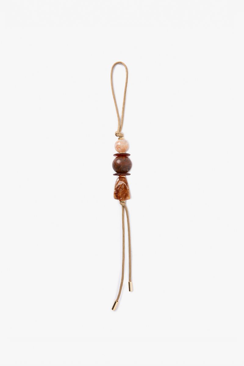 Afmeting: 42 cm. De bag charm is gemaakt van bruine kralen, lichtbruin touwtje met gold plated en brass details.