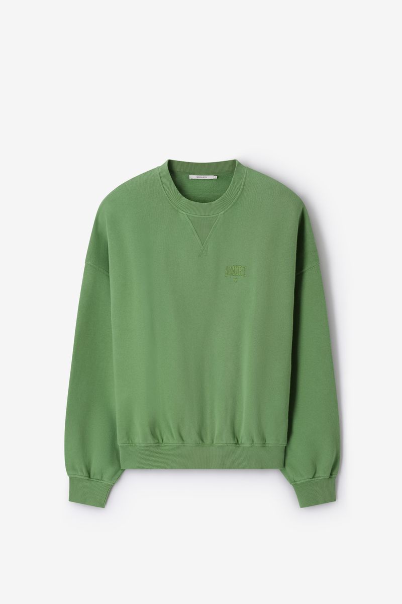 Verder heeft de sweater een groene kleur met een subtiele borduursel op de voorzijde. De sweater heeft lange mouwen, een ronde halslijn, ribboorden en een oversized fit.
