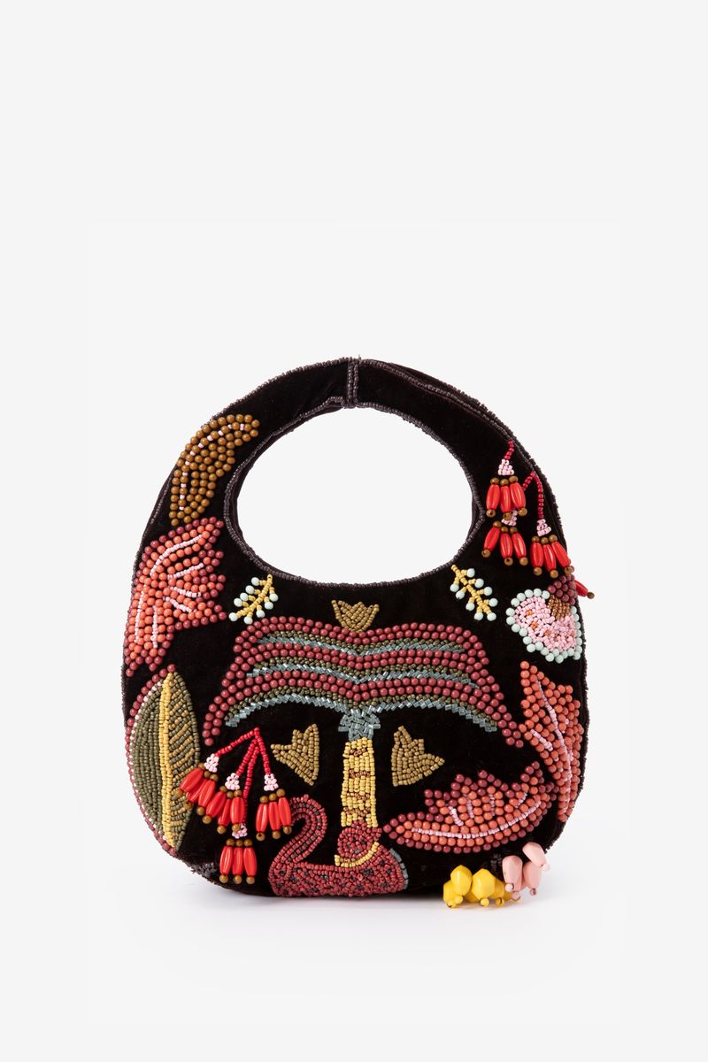 Verder heeft het tasje een magnetische sluiting, een binnenvakje en een goudkleurig hengsel. Het tasje is gemaakt van een bruine velvet stof en heeft opgestikte versieringen met kralen.