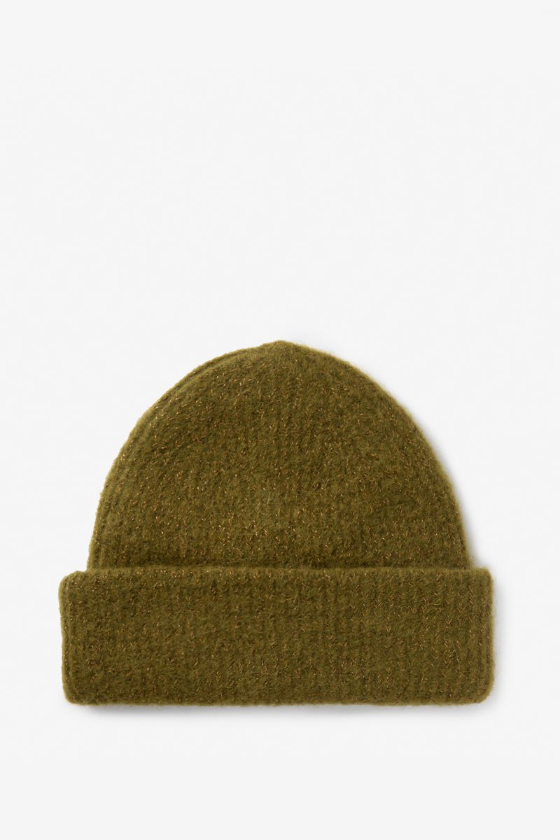 De muts heeft een omgeslagen rand, donkergroene kleur met glitter lurex details in de stof verwerkt. Donkergroene muts met lurex van Sissy-Boy.