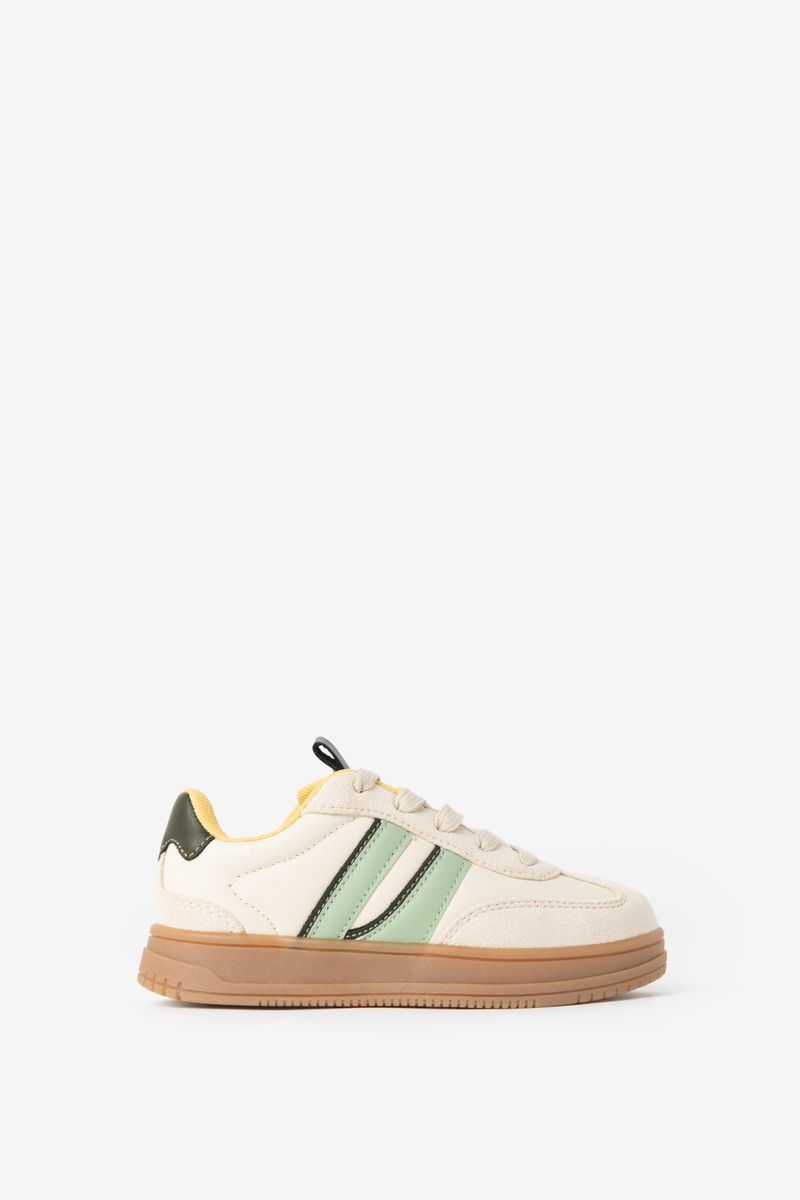 Verder hebben de sneakers een ronde neus, een dikke gum zool en een vetersluiting. De sneakers hebben een kleurinstelling van blauw, wit, groen, geel en bruin.