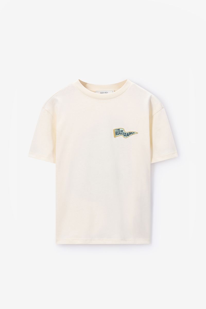 Verder heeft het t-shirt aan de voor- en achterzijde een grafisch artwork met blauwe en gele details. Het t-shirt heeft korte mouwen, een ronde hals en een relaxed fit.