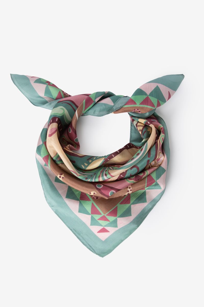 Afmetingen: 68 x 66 cm. Deze sjaal heeft een glanzende kwaliteit en is bedrukt met een all-over leopard print met palmboom details.