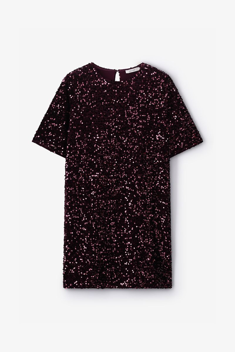 De velvet jurk heeft korte mouwen, een mini-lengte, een ronde halslijn en een rechte fit. Donkerrode t-shirt jurk met pailletten van Sissy-Boy.