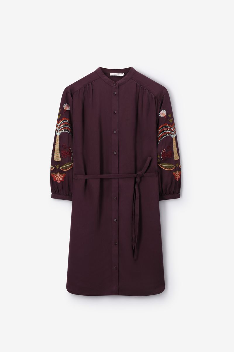 Verder heeft de jurk een donkerbruine kleur met een geborduurde palmboom op de mouwen. De jurk heeft lange pofmouwen, een ronde halslijn, een knoopsluiting, een afneembaar ceintuur in de taille en geplooide details bij de schouders.