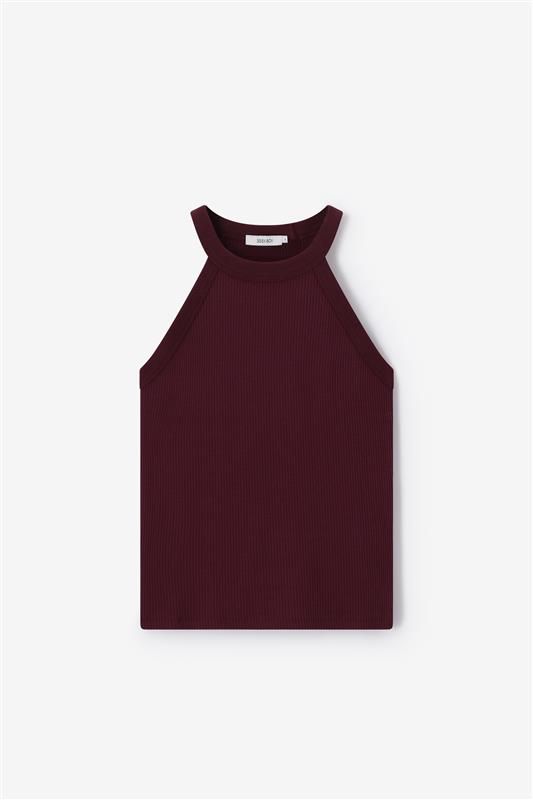 Het singlet heeft een ronde halslijn in de vorm van een halter en een all-over ribstof kwaliteit. Donkerpaars halter singlet van Sissy-Boy.