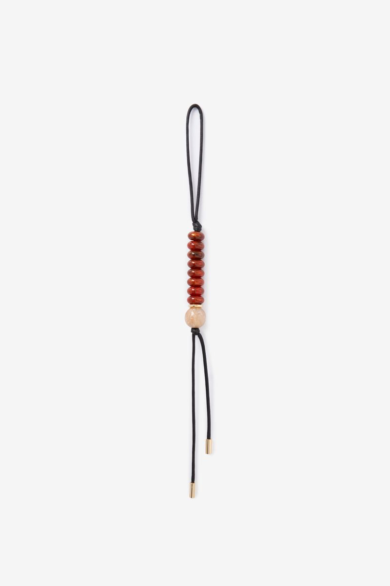 Afmeting: 42 cm. Met name chloor kan de sieraden permanent beschadigen of verkleuren. Vermijd contact met cosmetica (parfum, haarlak, make-up, nagellakremover, lichaamsolie, zonnebrandolie, handgel en deodorant). De bag charm is gemaakt van bruine kralen, zwart touwtje, gold plated en brass details.