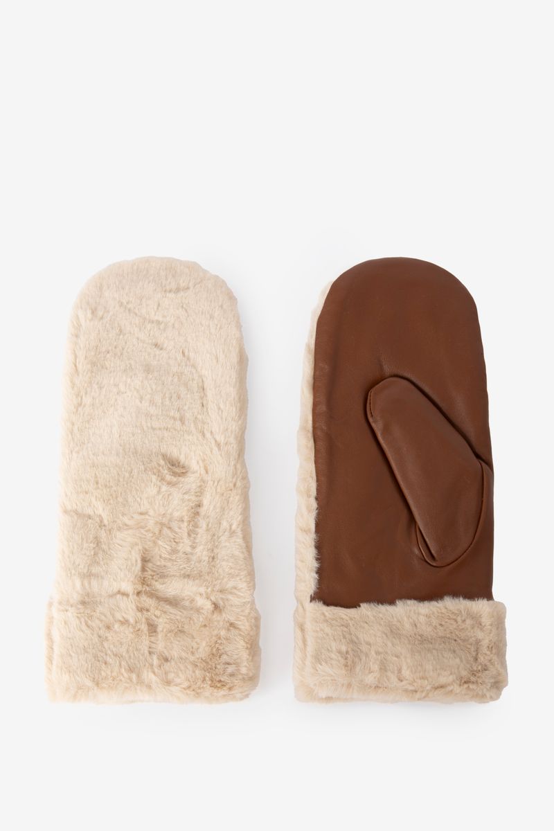 De wanten hebben een leren onderkant en houden je handen van binnen warm. Beige fur wanten van Sissy-Boy.