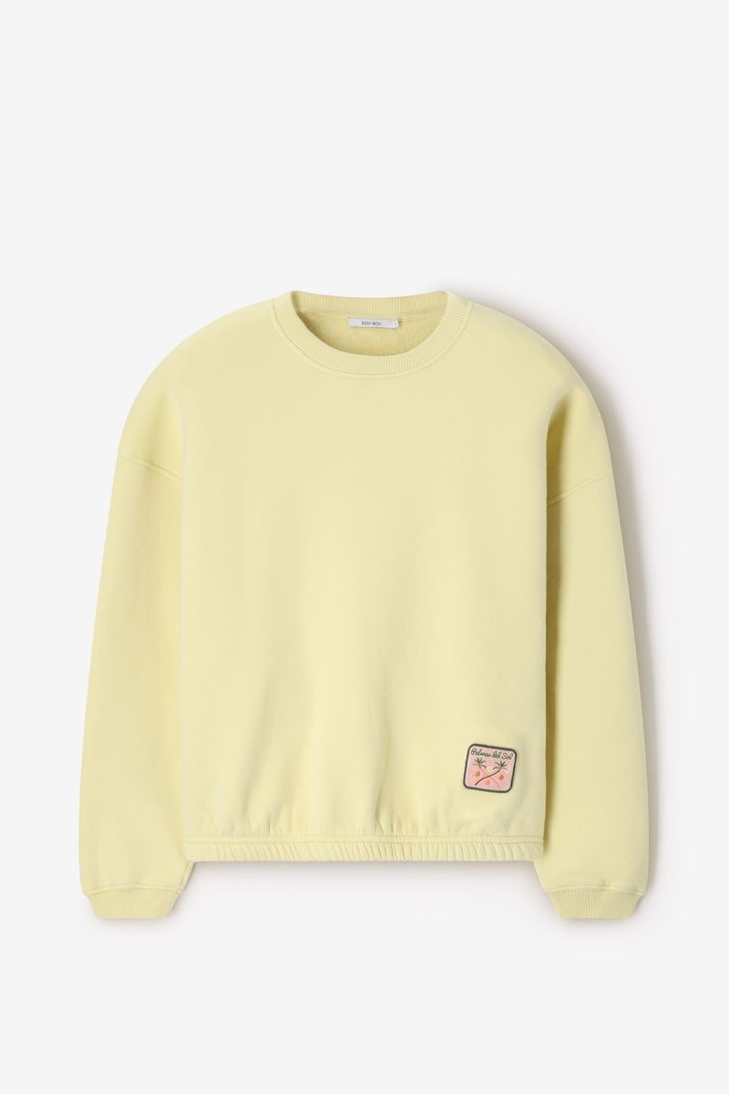 De sweater heeft lange mouwen, een ronde halslijn, ribboorden, verlaagde schouders en een palmbomen badge aan de onderzijde. Lichtgele sweater van Sissy-Boy.