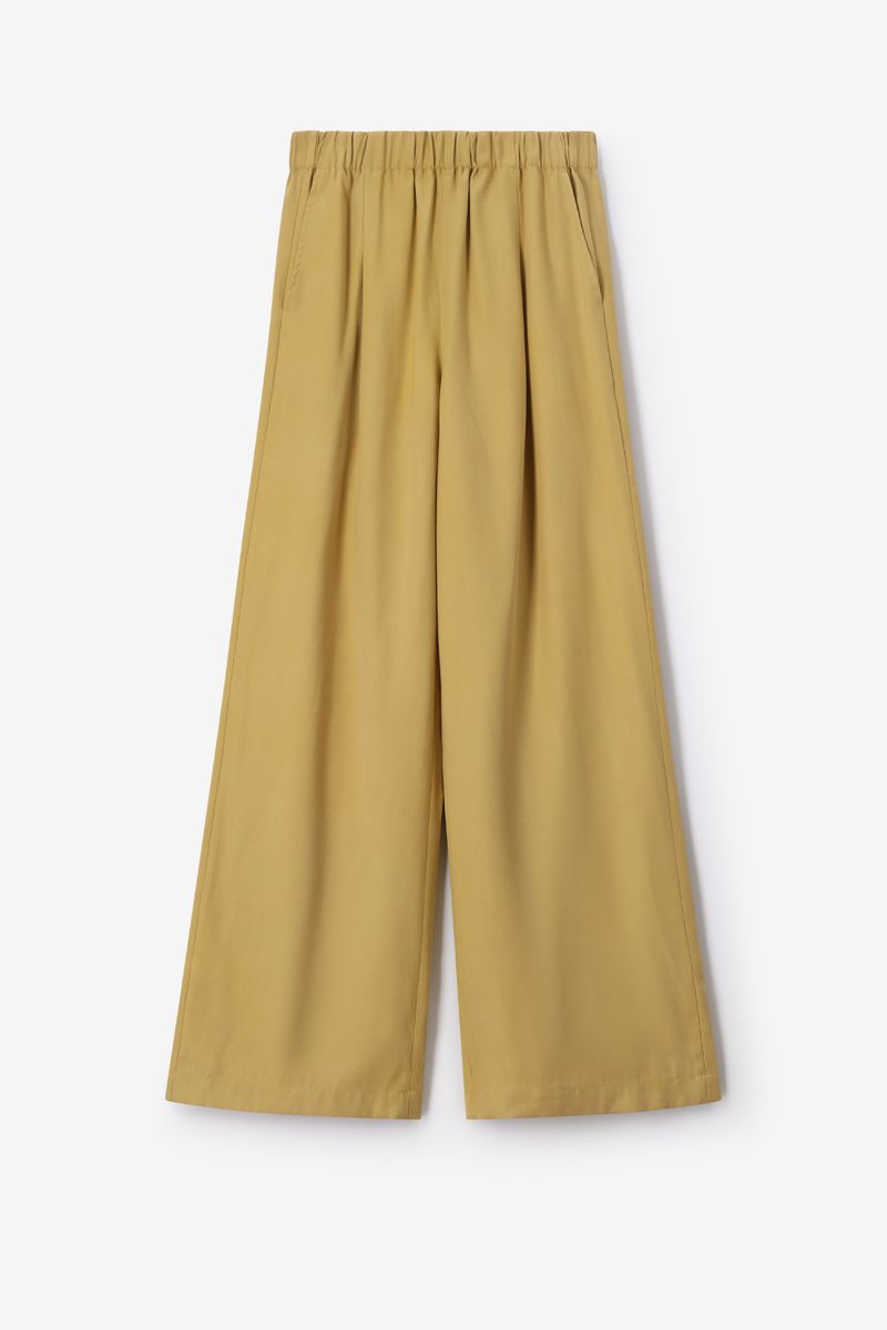 De Brianne broek heeft wijd uitlopende broekspijpen, een hoge taille, een elastische tailleband, steekzakken en geplooide details. Gele high waist wide leg broek van Sissy-Boy.