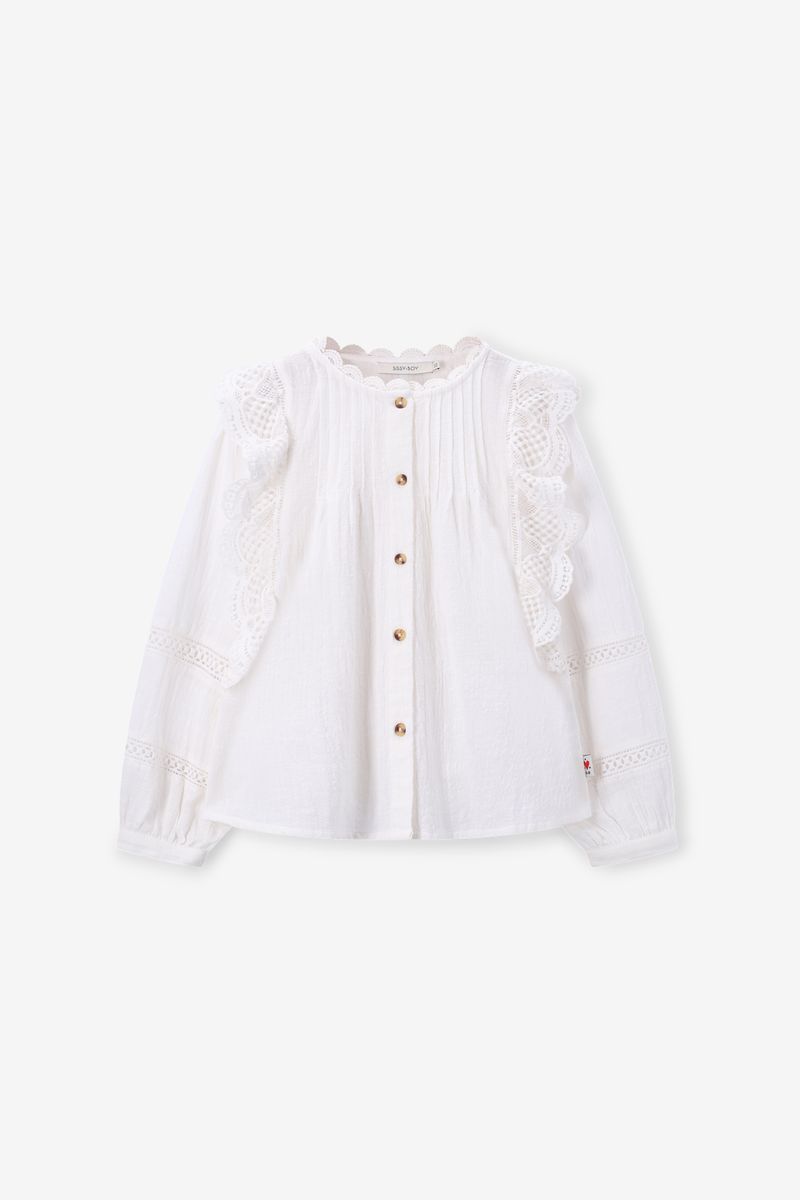 Verder heeft de blouse rond de hals en schouders kanten details. De blouse heeft lange mouwen, een ronde hals, knoopsluiting en een regular fit.