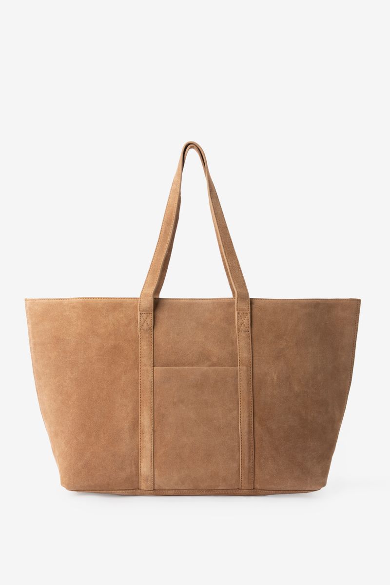 Afmeting: 32 x 60 x 15 cm. Materiaal: 100% leer. Verder heeft de shopper een binnenvak met een rits en een steekzak aan de voorzijde die openstaat. De shopper heeft een lichtbruine kleur met een suède kwaliteit.