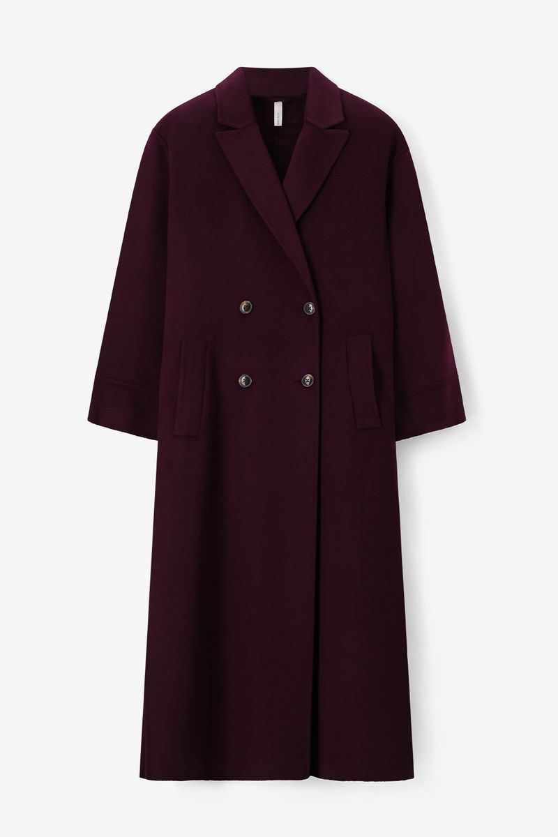 De jas heeft lange mouwen, een reverskraag, een knoopsluiting en steekzakken. Donkerrode wollen jas van Sissy-Boy.