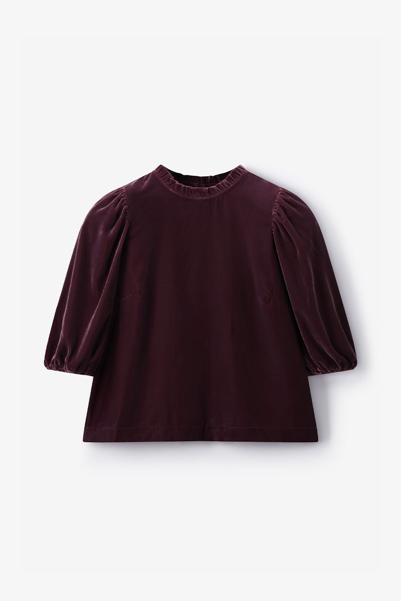 De top heeft driekwart pofmouwen, een ronde hals en een ruffle detail rond de hals. Donkerrode velvet top van Sissy-Boy.