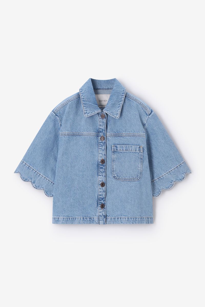 Verder heeft het jasje een katoenen denim kwaliteit en geschulpte randen aan de onderzijde van de mouwen. Het jack heeft korte mouwen, een kraag, knoopsluiting aan de voozijde,één opgestikte zak en een relaxed fit.