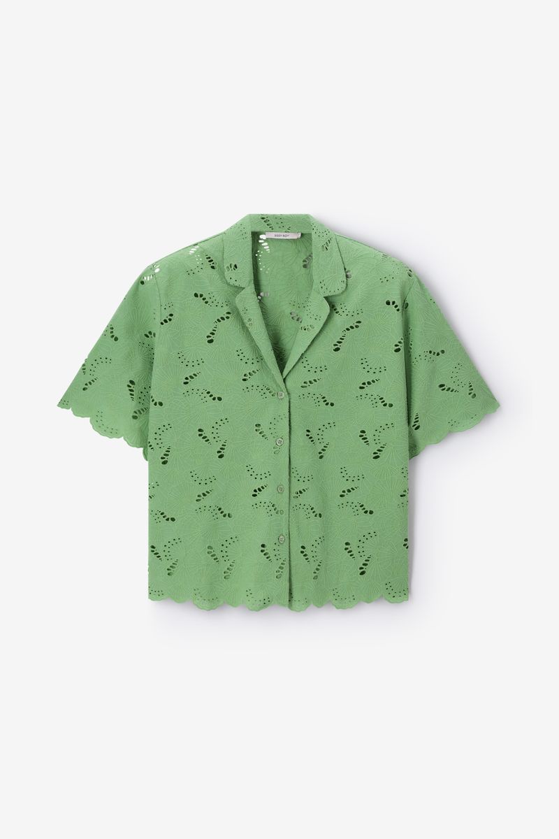 Verder heeft de blouse een groene kleur met een all-over broderie anglaise design. De blouse heeft korte mouwen, een kraag, een knoopsluiting en schulpranden aan de onderzijde van de blouse en mouwen.