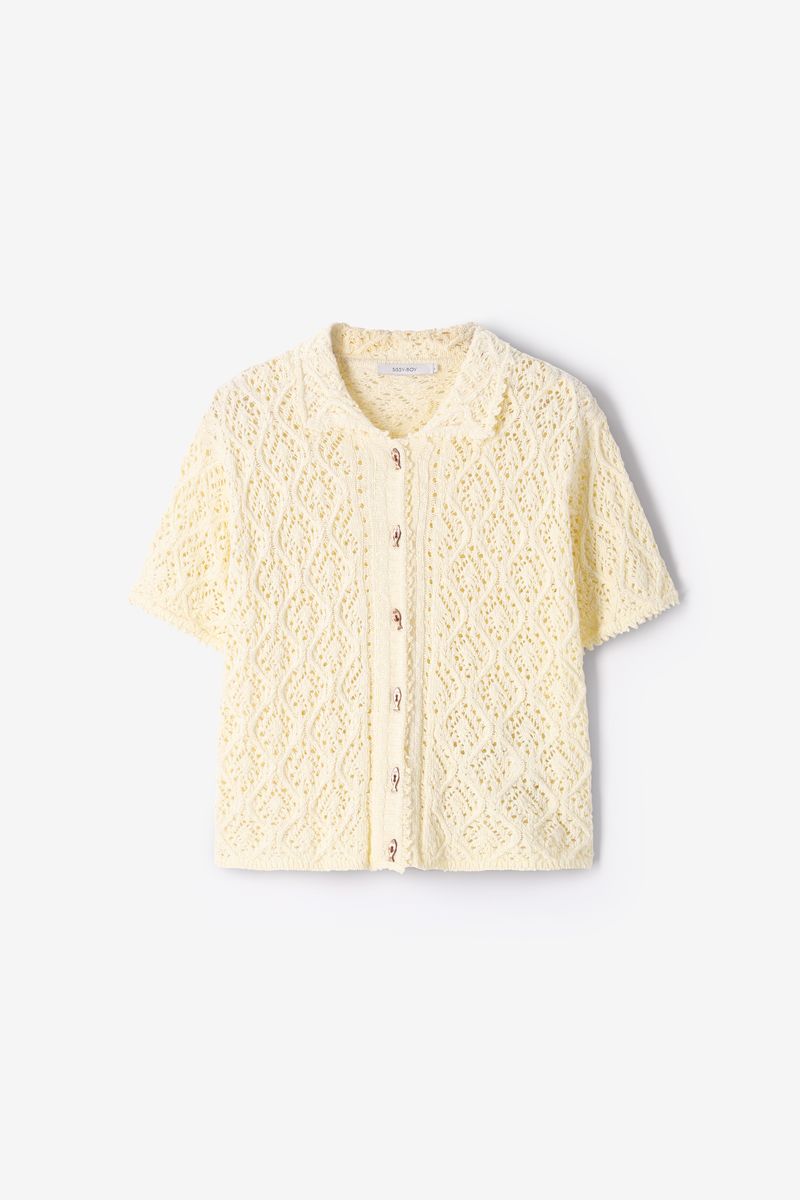 Verder heeft het vest een lichtgele kleur met een all-over crochet gebreid design. Het vest heeft korte mouwen, een polokraag en knopen in de vorm van visjes.