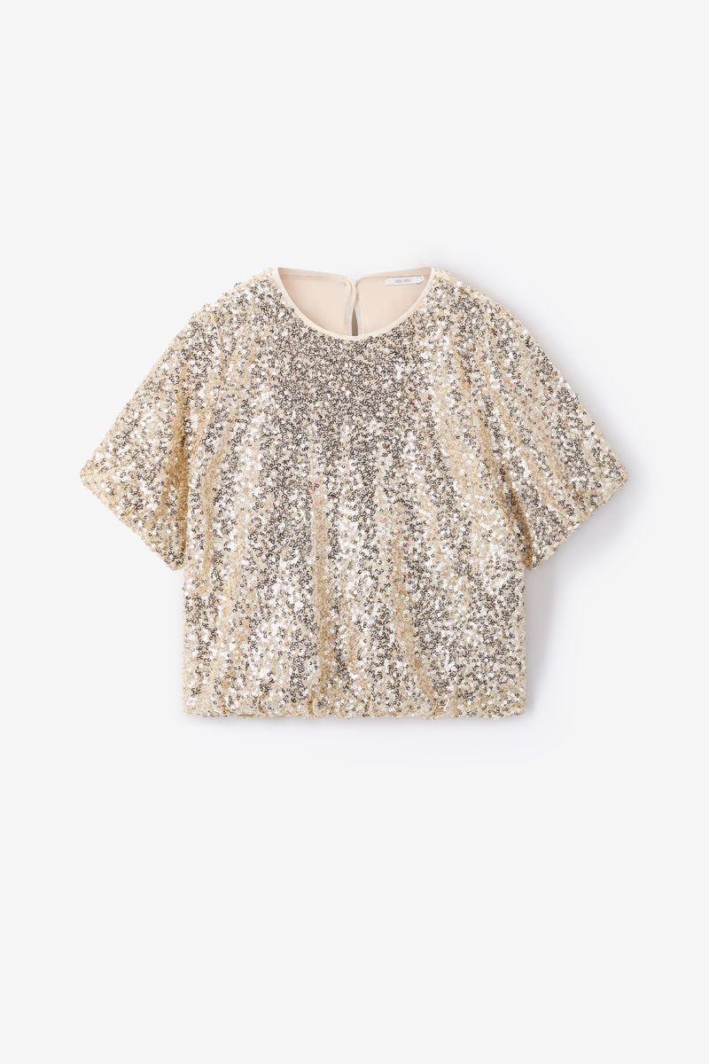 Verder heeft het T-shirt een gouden kleur met all-over pailletten. Het T-shirt heeft korte pofmouwen, een ronde hals en regular fit.