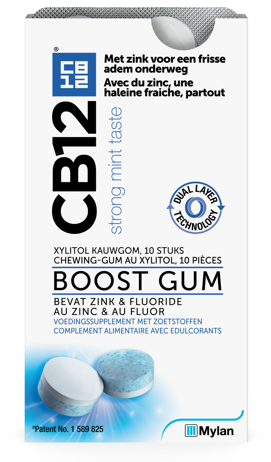 Het bevat tevens fluoride dat bijdraagt aan het behoud van tandmineralisatie. CB12 Boost is een suikervrije kauwgom met zink, die de geur van een slechte adem neutraliseert.