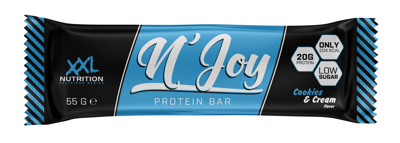 XXL Nutrition N'Joy Protein Bar - Cookies & Cream (55 gr) is een zeer smakelijke eiwitreep met een crispy topping.