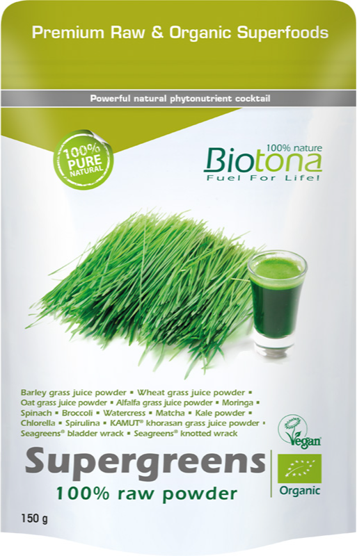 Deze samenstelling is samengesteld uit 100% pure bronnen van groen voedsel, elk met hun eigen unieke assortiment fytonutriënten, van nature aanwezig. Biotona Supergreens Raw Poeder is een aanvullende combinatie boordevol biologische en groene rauwe superfoods.