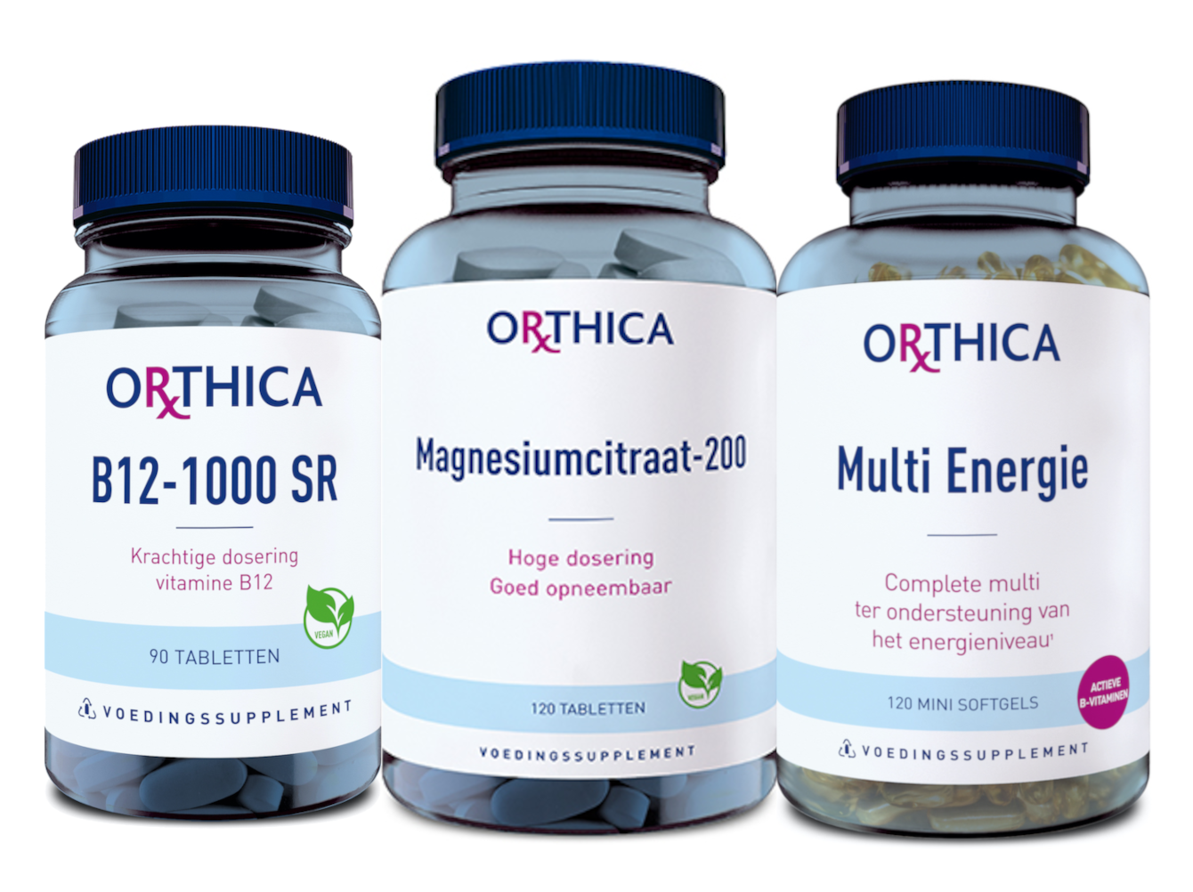 Diverse voedingsstoffen dragen hieraan bij, zoals B-vitaminen, waaronder B12, en magnesium. Orthica Bundel Energie is samengesteld uit Orthica B12 1000 SR Tabletten, Orthica Magnesium-200 Tabletten en Orthica Multi Energie Mini Softgels.