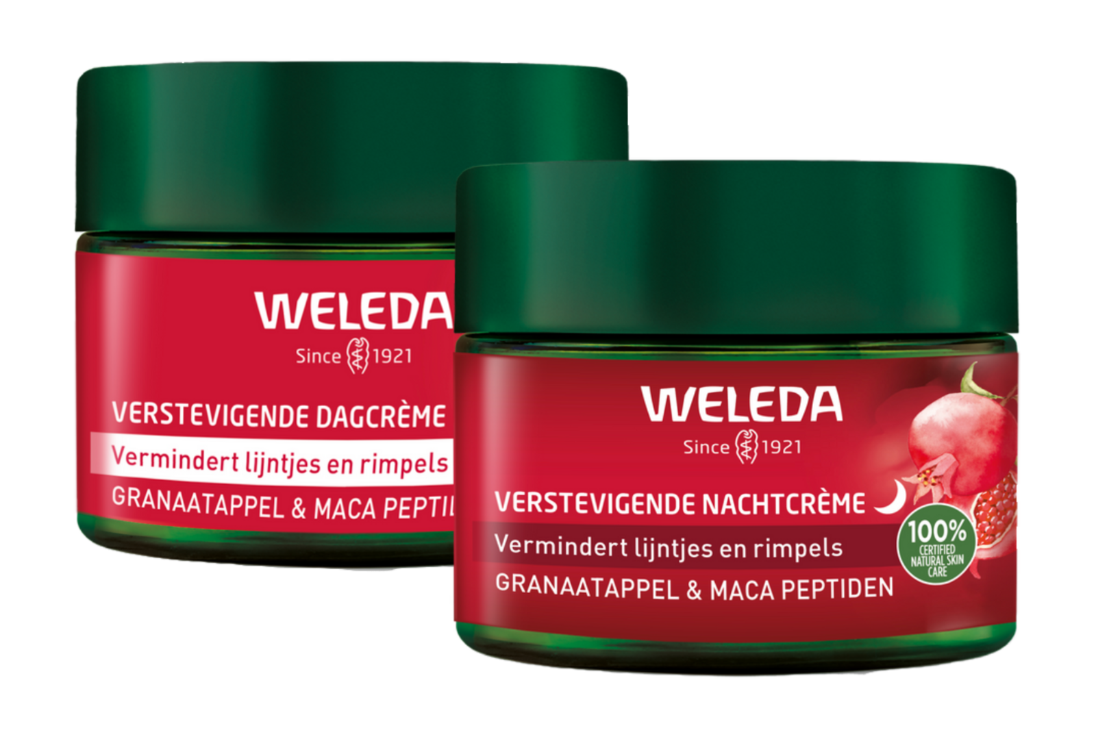 Weleda Gezichtsverzorging Anti-Age Combi bevat een combinatie van Weleda Granaatappel & Maca Verstevigende Dagcrème 40ml en Weleda Granaatappel & Maca Verstevigende Nachtcrème 40ml.