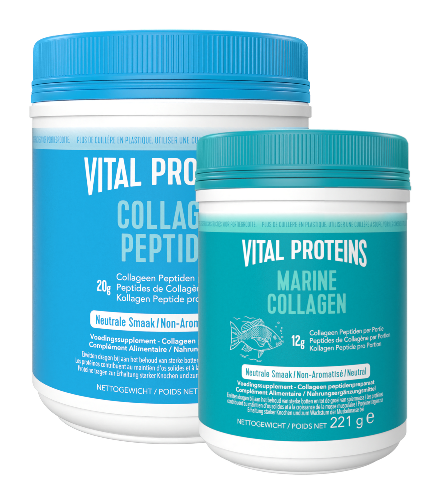 Vital Proteins Best Seller Bundel bevat een combinatie van Vital Proteins Collageen Peptiden 567GR en Vital Proteins Marine Collageen 221GR.