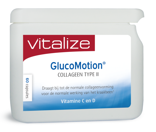 Vitamine C draagt bij tot de normale collageenvorming voor de normale werking van het kraakbeen en de botten. Vitalize GlucoMotion Collageen Type II Capsules (60 stuks) is een voedingssupplement op basis van ongedenatureerd collageen type 2, vitamine C en D3.