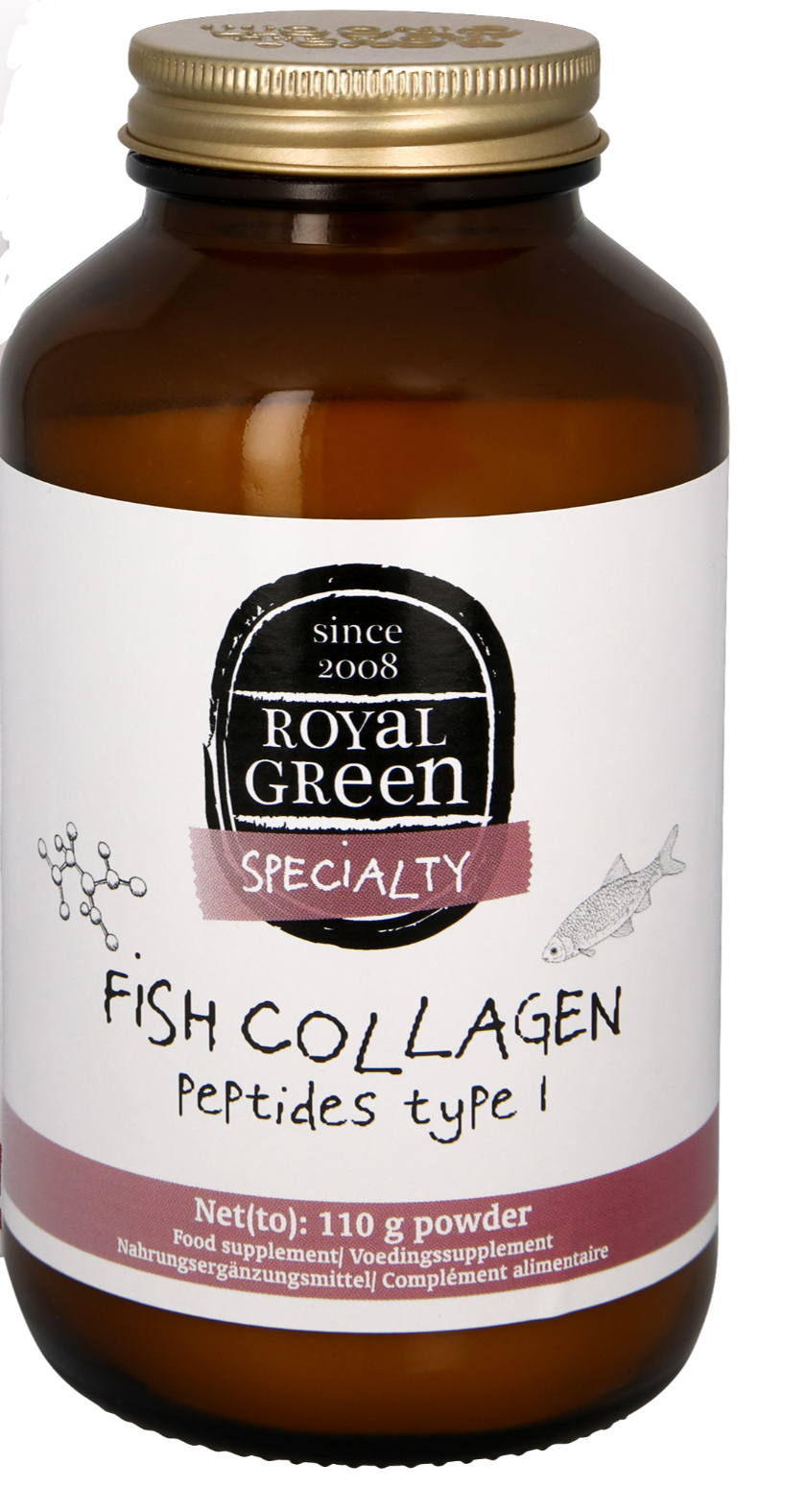 Royal Green Fish Collagen Peptide Type 1 Poeder (110 gram) bevat 100% zuivere, gehydrolyseerde collageenpeptiden type 1, afkomstig van wild gevangen vis.
