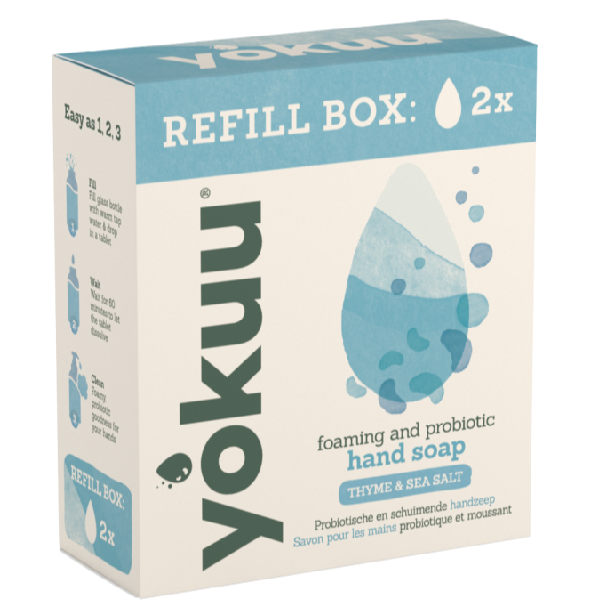 Yokuu Handzeep Thyme & Sea Salt Refill Box (2st) is een probiotische handzeep en bevat goede bacteriën die op natuurlijke wijze vuil en onzuiverheden afbreken, terwijl de huid gehydrateerd blijft.