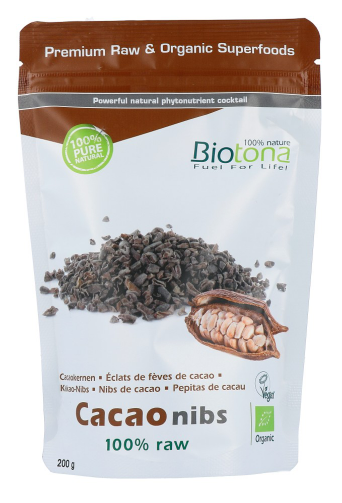 Biotona Cacao Nibs 100% Raw (200 gram) zijn heerlijke, krokante cacaokernen die afkomstig zijn van de bonen van de Theobroma cacao boom.