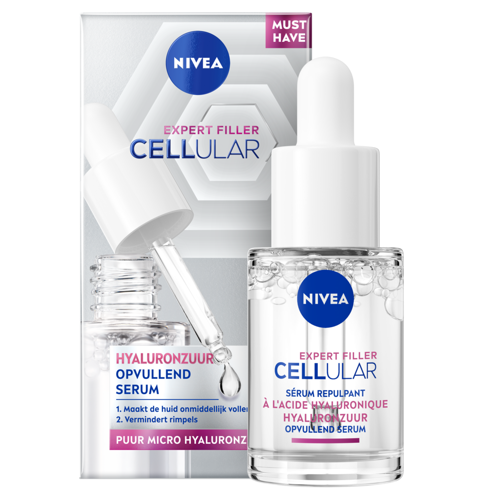 Dit geavanceerde serum bevat pure micro-hyaluronzuur, een krachtig hydraterend molecuul dat van nature in onze huid voorkomt. Nivea Cellular Expert Filler Hyaluron Vullend Serum (15 ml) voor een gehydrateerde en jeugdigere huid.
