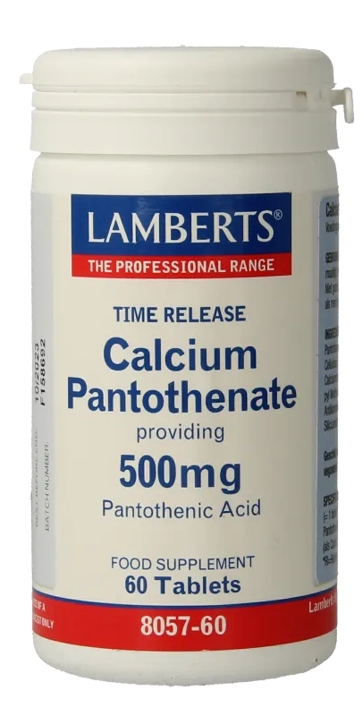 Het is ook bekend als vitamine B5. Lamberts Calcium Pantothenaat 500 mg Tabletten (60 stuks) is een in water oplosbare vitamine die behoort tot het vitamine B-complex.