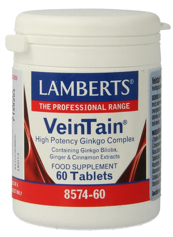 Lamberts Veintain Tabletten (60 stuks) is een voedingssupplement en bevat ginkgo biloba, kaneel en gember.