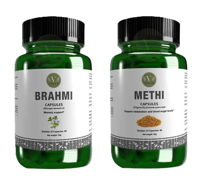 Vanan Methi Capsules (60st) is een vegan voedingssupplement op basis van fenegriek zaad, in India Methi genoemd. Vanan Geest en Geheugen Booster (2st) bevat een combi van Combi set Vanan Methi 60 Capsules & Vanan Brahmi 60 Capsules.