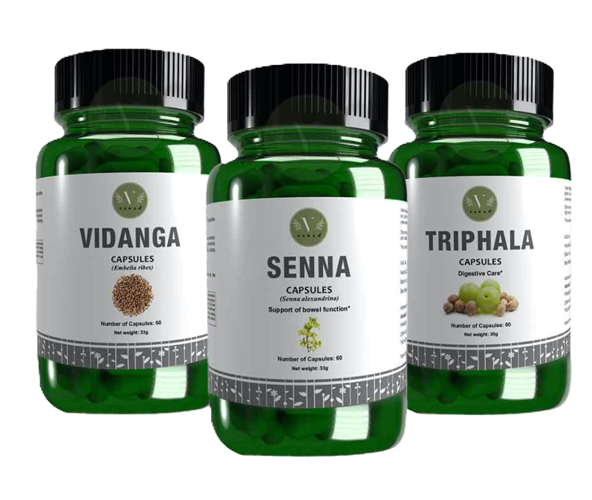 Vanan Complete Reinigings- en Reparatieset (3st) bevat een combinatie van Vanan Triphala Capsules (60st) , Vanan Senna Capsules (60st) en Vanan Vidanga Capsules (60st).