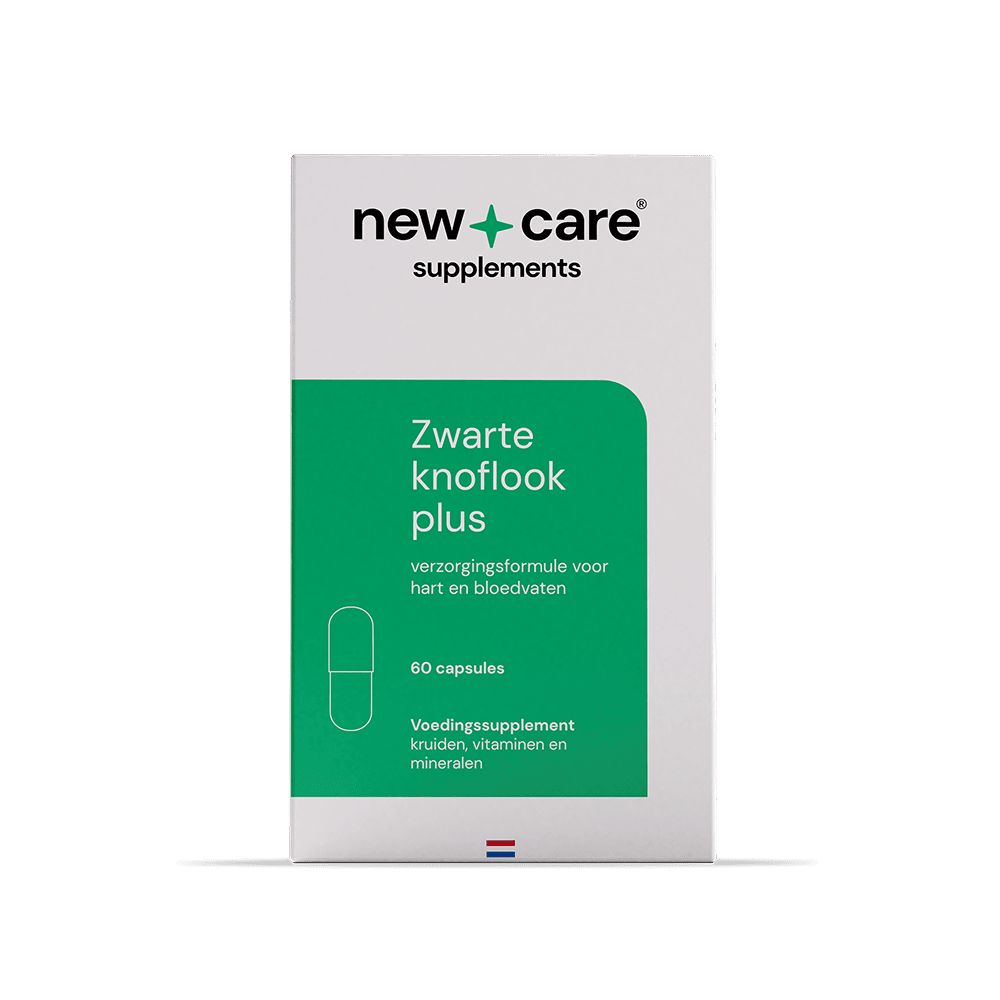 New Care Zwarte Knoflook Plus Capsules (60 stuks) bevat gefermenteerde zwarte knoflook, die net als witte knoflook gunstige effecten heeft op hart en bloedvaten, maar zonder de scherpe geur en smaak.