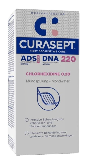 Curasept ADS DNA 220 Chloorhexidine 0.20% Mondwater (200ml) is een intensieve, alcoholvrije mondspoeling met een hoge concentratie chloorhexidine (0,20%) voor maximale ondersteuning van de mondhygiëne.