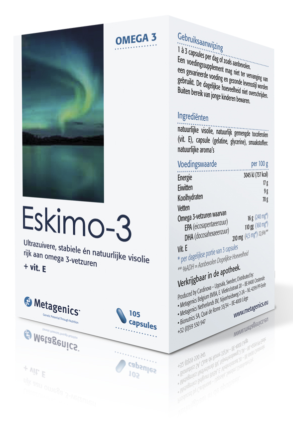 EPA en DHA ondersteunen een goede hartfunctie. Metagenics Eskimo 3 Capsules is een voedingssupplement op basis van omega 3-vetzuren EPA en DHA, gecertificeerd onder het ecolabel Friend of the Sea.